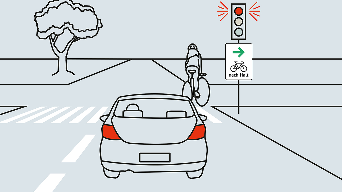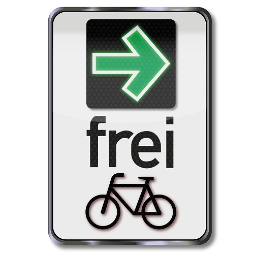 Yetkililerin bu işareti koyduğu yerde, gelecekte bisikletçilerin de kırmızıda sağa dönmelerine izin verilecek. "T-kavşakları" olarak adlandırılan yerlerde, kırmızıda dümdüz ilerlemek de mümkün olacak. Her ikisi için de ön koşul, önünde durmanız ve özellikle yayalar için tehlikesiz bir şekilde yola çıkabilmeniz veya sürüşe devam edebilmenizdir. Diğer yeni trafik işaretleri, örneğin tabelalar, bisikletliler hariç çıkmaz sokaklar ve daha fazlasıyla ilgili.