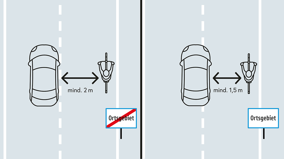 Gelecekte, arabalar bisikletleri sollarken belirli bir mesafeyi korumak zorunda kalacaklar. Kesin olmayan bir temel kural yerine, ilk kez 30 km/s'den itibaren kesin ve zorunlu minimum mesafeler geçerli: yerleşim alanlarında 1,5 metre ve yerleşim alanlarının dışında 2 metre.