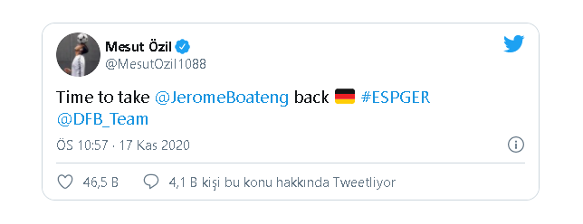 Özil, paylaşımında “Jerome Boateng’i Milli Takım’a çağırmanın tam zamanı” ifadelerini kullandı.