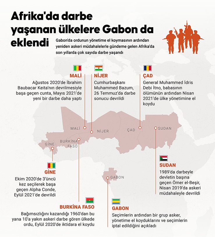Sudan, Çad, Mali, Burkina Faso ve Nijer'in ardından Gabon'da da tartışmalı seçim sonrası ordu yönetime el koyduğunu açıkladı.