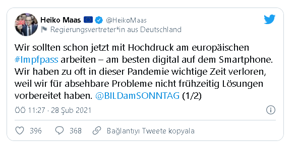 Koronavirüse karşı aşılamanın başlamasının Avrupa Birliği üyesi ülkeler arasında başlayan aşı pasaportu çalışmalarına bir açıklamada Almanya Dışişleri Bakanı Heiko Maas'tan geldi.