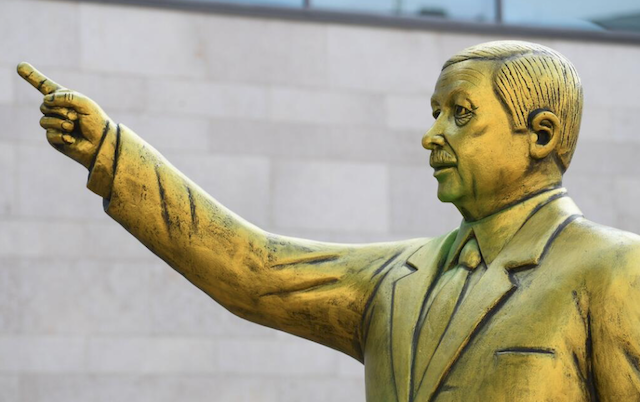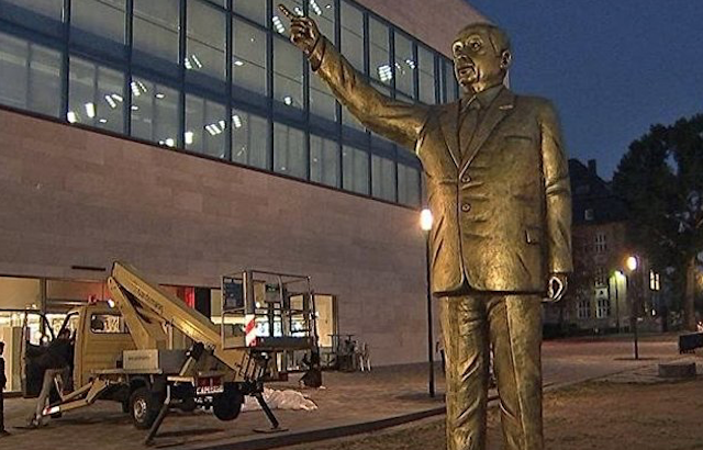 Almanya'da Wiesbaden Bienali'nin kültürel etkinlikleri çerçevesinde Wiesbaden kentinin ortasına Cumhurbaşkanı Recep Tayyip Erdoğan'ın heykeli dikildi. Pazartesi akşamı 'Alman Birliği' isimli meydandan geçenler polis merkezine 1 metre mesafede altından devasa Erdoğan heykeliyle karşılaşmanın şaşkınlığını yaşadı.