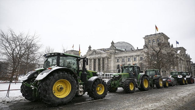 Almanya'da çevreci kanunların kendilerini zor durumda bıraktığını ve yerli üretimin ithalatla rekabet edemediğini savunan çiftçiler, traktörleriyle Almanya Başbakanlık ve Federal Meclis binası önündeki caddeyi araç trafiğine kapatarak protestolarını gerçekleştirdi.