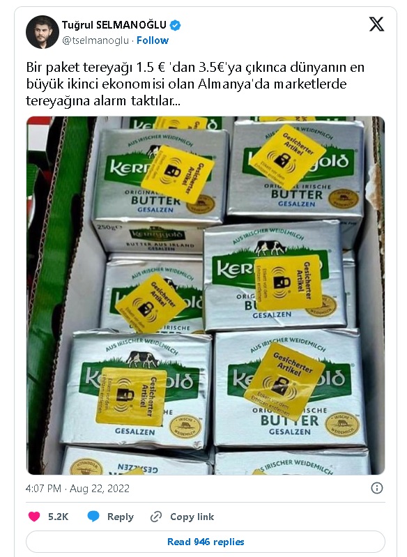 Sosyal medyada yapılan bazı paylaşımlarda ise 2022 yılında yaşanan fiyat artışında marketlerin tereyağı paketlerine alarm koyduğu hatırlatılarak, bu durumun yeniden yaşanabileceği öngörüsünde bulunuldu.