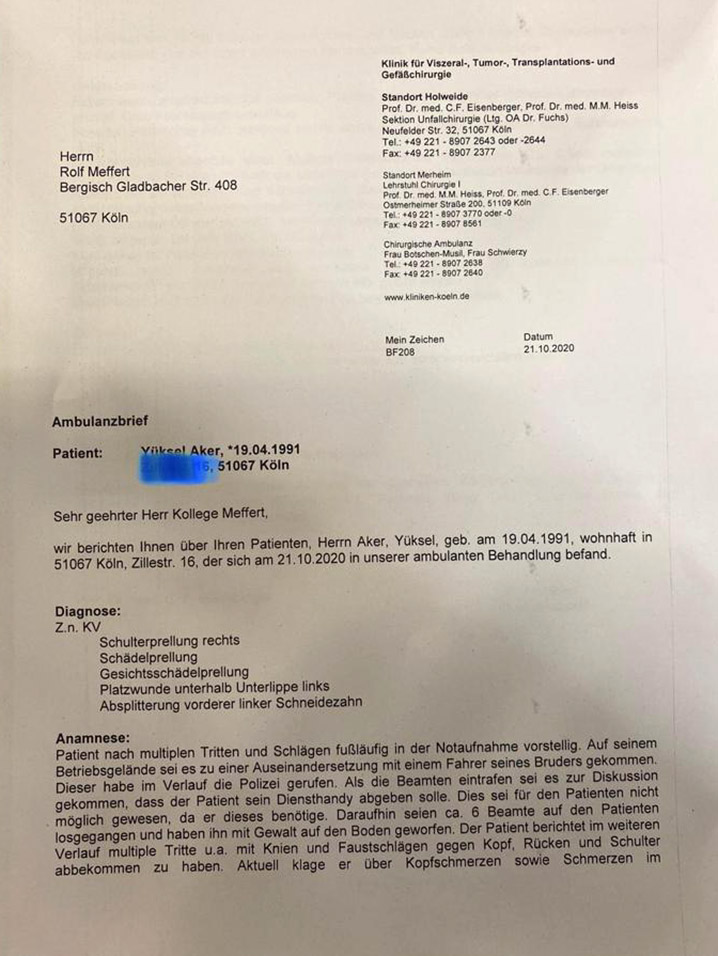 Köln'de yaşanan polis şiddetini Aker ailesi Köln Belediyesi nezdinde girişimler başlatarak Köln Emniyetinde görevli polisler aleyhinde savcılık nezdinde suç duyurusunda bulundu. Yüksel Aker Hastahane’ye giderek polis şiddetini belgeledi.