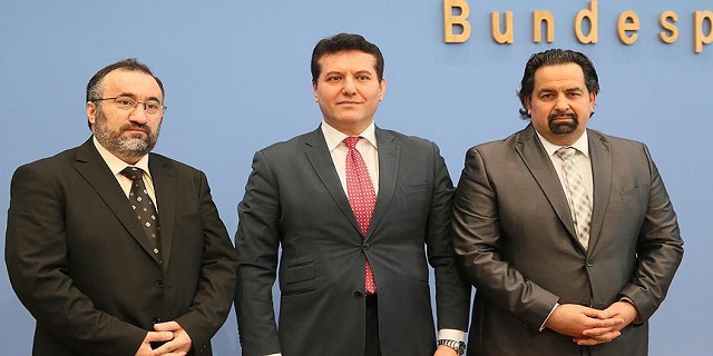 Berlin'deki Federal Basın Merkezi'nde Almanya'daki cami saldırıları konusunda düzenlenen basın toplantısına, DİTİB Dış İlişkiler Müdürü Zekeriya Altuğ, Almanya İslam Konseyi Başkanı Burhan Kesici, ZMD Başkanı Aiman Mazyek katıldı.