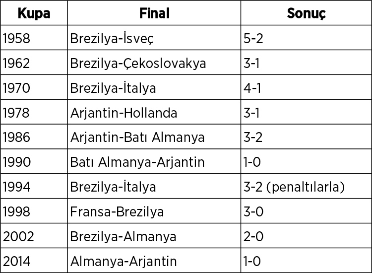 Dünya Kupası finallerinde bugüne kadar Güney Amerika ile Avrupa ülkeleri 10 kez karşılaştı. Bu maçların 7'sinde Güney Amerika temsilcileri şampiyonluğa ulaşırken, 3'ünde Avrupa ülkeleri güldü.