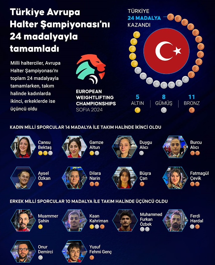 Sofya'daki Avrupa Halter Şampiyonası'nda kadın milli sporcular; 3 altın, 3 gümüş ve 8 bronz olmak üzere toplam 14 madalya kazanarak takım halinde ikincilik kupasını da kaldırdı.
