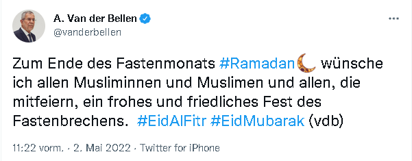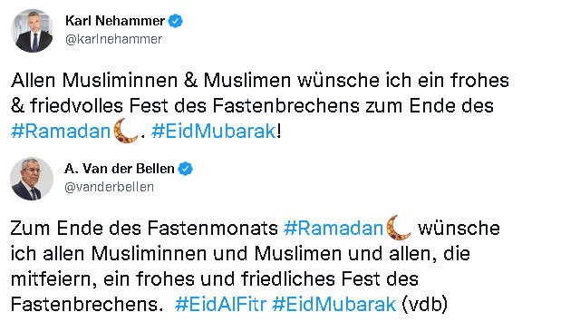 Cumhurbaşkanı Alexander Van der Bellen, yaptığı paylaşımda: Ramazan ayının sonunda tüm Müslümanların ve kutlayan herkesin mutlu ve huzurlu bir bayram geçirmesini dilerim. #EidAlFitr #EidMubarak (vdb)‘ yazdı.
