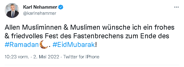 Başbakan Karl Nehammer ise: 'Tüm Müslümanların #Ramazan ayının sonunda oruçlarını açtıkları mutlu ve huzurlu bir bayram dilerim. #EidMubarak!' tweeti attı.