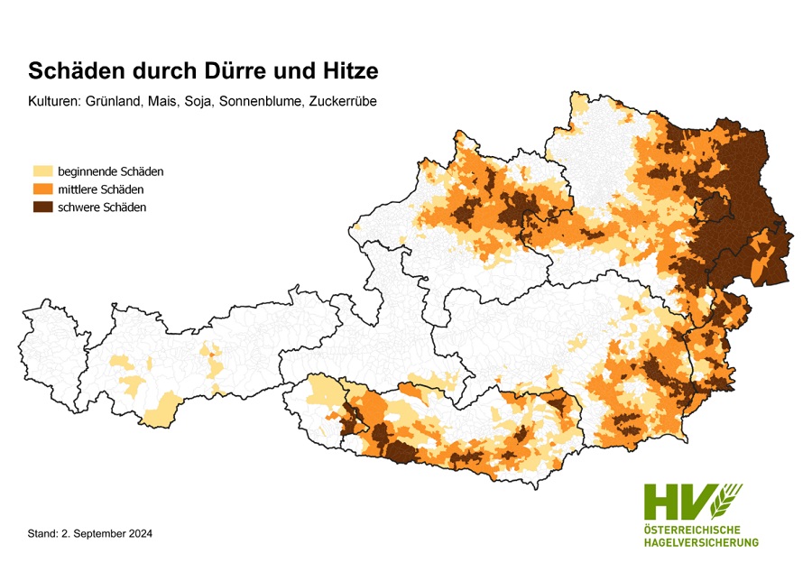İklim ve Toprak Koruması Gerekiyor Bu yılın nihai zarar miktarı Eylül ayı sonunda belirlenecek, ancak kuraklığın gelecekte tarım için sürekli bir tehdit olacağı şimdiden belli. "Tarım sektörü, küresel ısınmadan en fazla etkilenen sektörlerin başında geliyor. Avusturyalı çiftçiler, iklim değişikliğinin artan risklerini çoktan fark etti. Bugün itibariyle, tarım arazilerinin yaklaşık %80'i kuraklık, dolu, sel, don gibi afetlere karşı sigortalı, bu sayede sigortalı işletmelerde en azından zararın bir kısmı karşılanabiliyor. Ancak yine de tam kapsamlı bir sigorta mevcut değil" diyen Weinberger, güçlü bir tarım sektörü sağlamak için iklim ve toprak korumasının öneminin ciddiye alınması gerektiğini vurguladı.