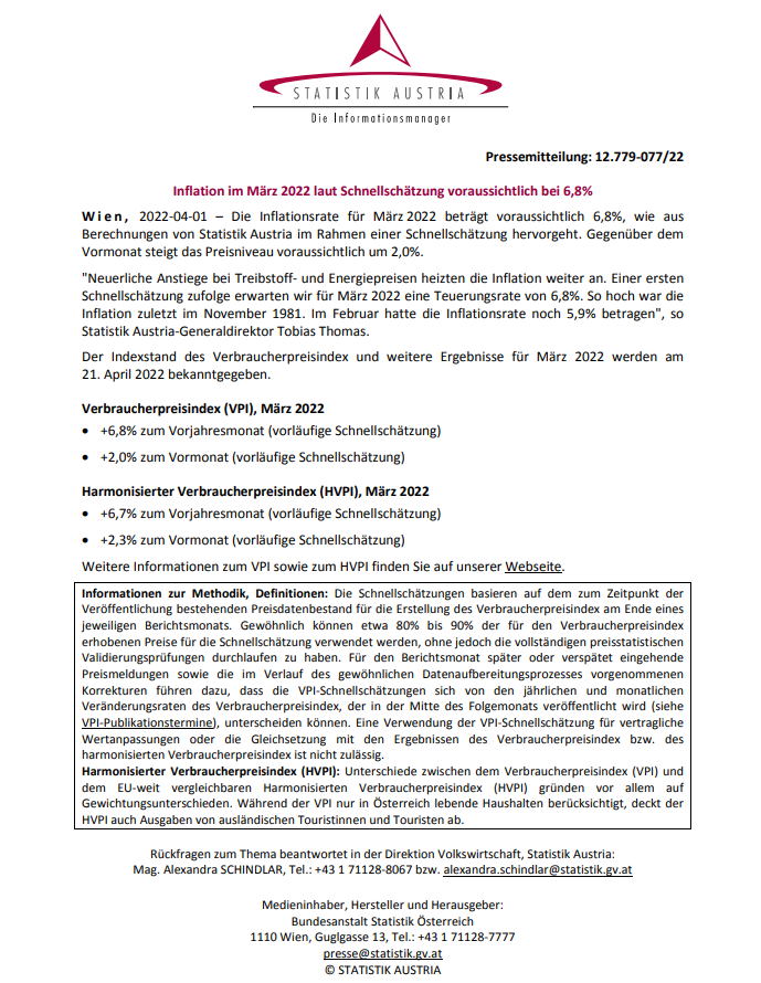 Avro bölgesi karşılaştırmaları için hesaplanan uyumlaştırılmış enflasyon oranı (HICP), bir ön flaş tahminin parçası olarak İstatistik Avusturya tarafından yapılan hesaplamalara göre, Mart 2022'de geçen yılın aynı ayına göre yüzde 6,7 oldu. İlk ankete göre enflasyon Şubat ayına göre yüzde %2,3 oldu.