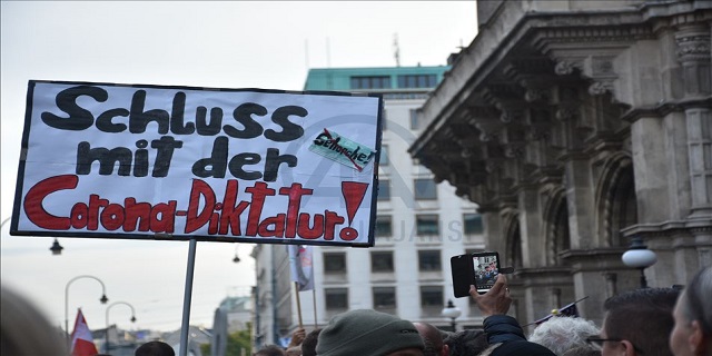 Avusturya Devlet Tiyatrosu önünde toplanan göstericiler, "Corona (Covid-19) diktatörlüğüne son", "Korkudan kazananlar kim" ve "Covid-19 önlemlerine birlikte karşı duralım" yazılı pankartlar açtı.