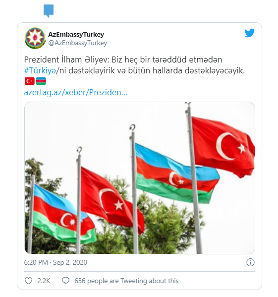 Tutumumuzu bilmenizi istiyorum. Bu durum benim talimatım üzerine Azerbaycan hükümeti tarafından resmen ilan edildi. Türkiye bizim için sadece dost değil, kardeş bir ülkedir ve Türkler bizim kardeşimizdir. Bu yüzden her konuda onların yanında olacağız.