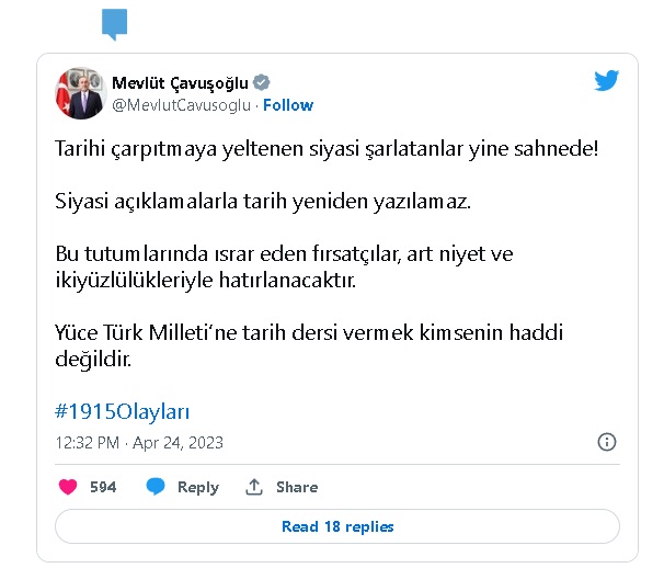 "Tarihi çarpıtmaya yeltenen siyasi şarlatanlar yine sahnede! Siyasi açıklamalarla tarih yeniden yazılamaz. Bu tutumlarında ısrar eden fırsatçılar, art niyet ve iki yüzlülükleriyle hatırlanacaktır. Yüce Türk Milleti'ne tarih dersi vermek kimsenin haddi değildir."