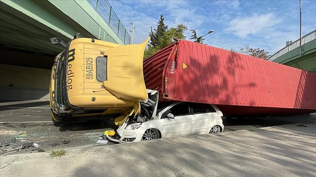 Çarpmanın etkisiyle dengesini kaybeden tır, yanında aynı istikamette seyir halindeki S.S.D'nin kullandığı 34 VY 4343 plakalı otomobilin üzerine devrildi.