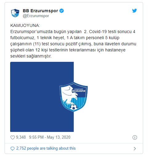 "Erzurumspor'umuzda bugün yapılan ikinci Covid-19 testi sonucu 4 futbolcumuz, 1 teknik heyet, 1 A takım personeli ve 5 kulüp çalışanının test sonucu pozitif çıkmış, buna ilaveten durumu şüpheli olan 12 kişinin testlerinin tekrarlanması için hastaneye sevkleri sağlanmıştır. Detaylar ilerleyen süreçte paylaşılacaktır."