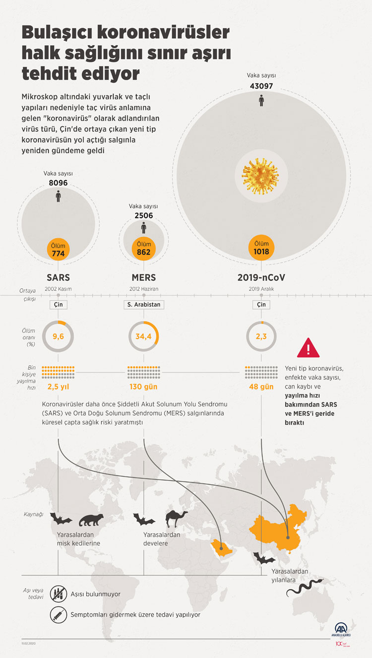 Dünya çapında 43 bin 97 kişide görülen yeni tip koronavirüs, etki ve yayılma bakımından, 8 bin 96 kişiyi etkileyen SARS'ı ve 2 bin 506 kişiyi etkileyen MERS'i açık ara geride bıraktı.