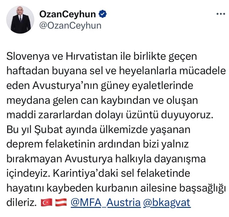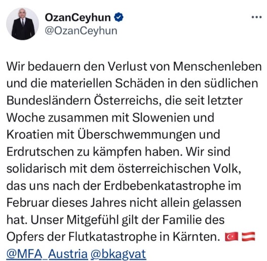 “Bizi yalnız bırakmayan Avusturya halkıyla dayanışma içindeyiz. Karintiya’daki sel felaketinde hayatını kaybeden kurbanın ailesine başsağlığı dileriz.” Sözlerini kaydetti.