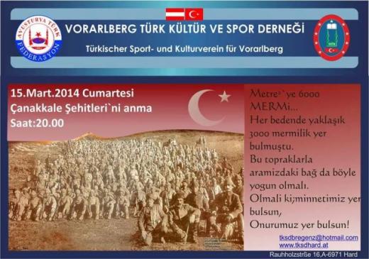 Vorarlberg Türk Kültür ve Spor Derneği, Çanakkale Şehitlerini anma gecesi düzenliyor...