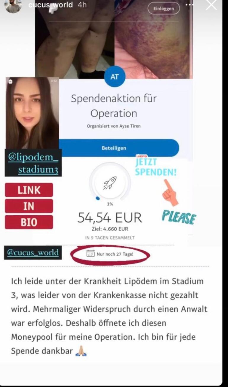 Ayşegül, hastalığın bütün kollar ve bacaklarda olduğunu belirtirken, “Hayırsever insanların yardımına ihtiyacım var şimdilik. Sağlığıma kavuştuğum zaman geri öderim. Ama şu an yardıma ihtiyacım var. Çevremde kimsem yok. Mahkeme de devam ediyor. Çaresizim.” dedi. Bu arada fil hastası (lenfödem) Ayşegül Tren için yakından tanıyanlar İnstangram üzeri paypoll hesabı üzerinden bir yardım kampanyası başlattılar. Ayrıca, yardım etmek isteyenler direkt olarak Ayşegül Tren’in resmi sayfası, lipodem_stadium3 üzerinden kendisi ile iletişime geçebilirler.