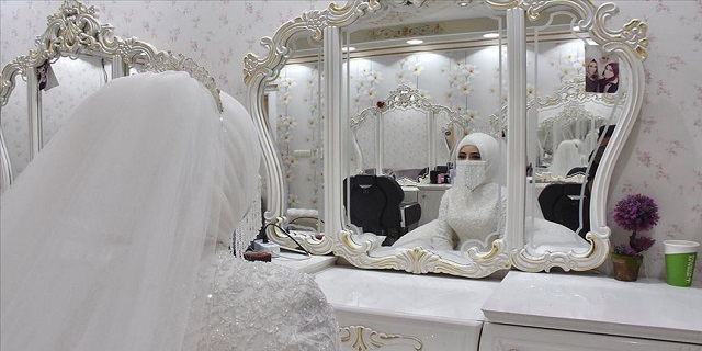 Yeni tip koronavirüsten (Kovid-19) korunma yöntemleri arasında önemli yere sahip cerrahi maskeler, evlilik hazırlığı yapan kadınların gelinlik kombinasyonlarının bir parçası haline geldi.