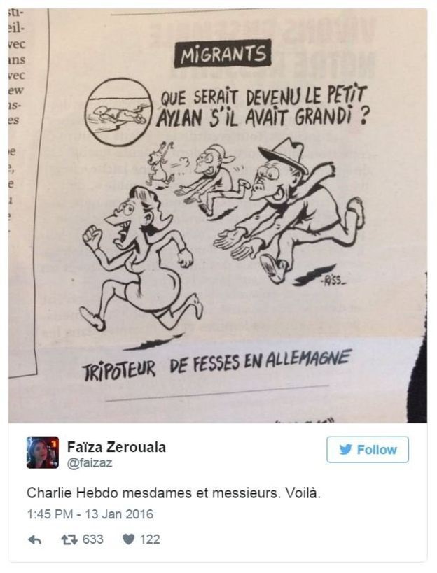 Charlie Hebdo'nun bu karikatürü, Almanya'nın Köln kentindeki yılbaşı kutlamalarında 100'e yakın kadının göçmenlerden oluştuğu belirtilen gruplar tarafından toplu tacize uğramasının ardından geldi. Hiciv tarzı mizahı benimseyen dergiye sosyal medyadan tepki yağdı ve dergi 'ırkçılık' yapmakla suçlandı. Twitter kullanıcıları karikatürü "iğrenç", "zevksiz" sözleriyle eleştirdi ve 'İslamofobik' olmakla suçladı.