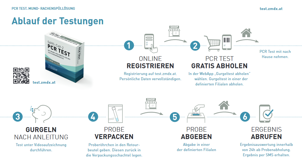 Vorarlberg'de, PCR tarama testleri Nisan ayından itibaren "Vorarlberg gurgelt" platformu üzerinden işlenmeye devam edecek. Daha önce olduğu gibi, PCR kendi kendine gargara testleri için 172 toplama ve dağıtım noktası mevcut. Ayda beş ücretsiz testin üst sınırı, platforma kayıt yoluyla kontrol edilecek. Şu anda Eczaneler aracılığıyla bir PCR test varyantı da istişare edilmekte.