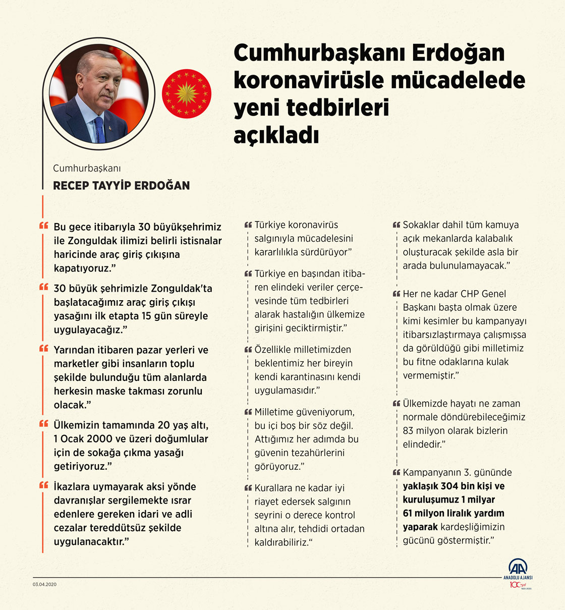 Erdoğan, "Amacımız vatandaşımıza eziyet etmek değil, hem kendi sağlığını hem de onlarla temas edenlerin sağlığını güvence altına almaktır. Ülkemizde hayatı ne zaman normalde döndürebileceğimiz 83 milyon olarak bizlerin elindedir. Kurallara ne kadar iyi riayet edersek, salgının seyrini o derece hızlı kontrol altına alır ve tehdidi tamamen ortadan kaldırabiliriz. Aksi halde bugün üzüntüyle takip ettiğimiz kimi ülkelerin durumuna düşmemiz kaçınılmazdır. Milletime güveniyorum. Attığımız her adımda bu güvenin tezahürlerine şahit olabiliyoruz." dedi.