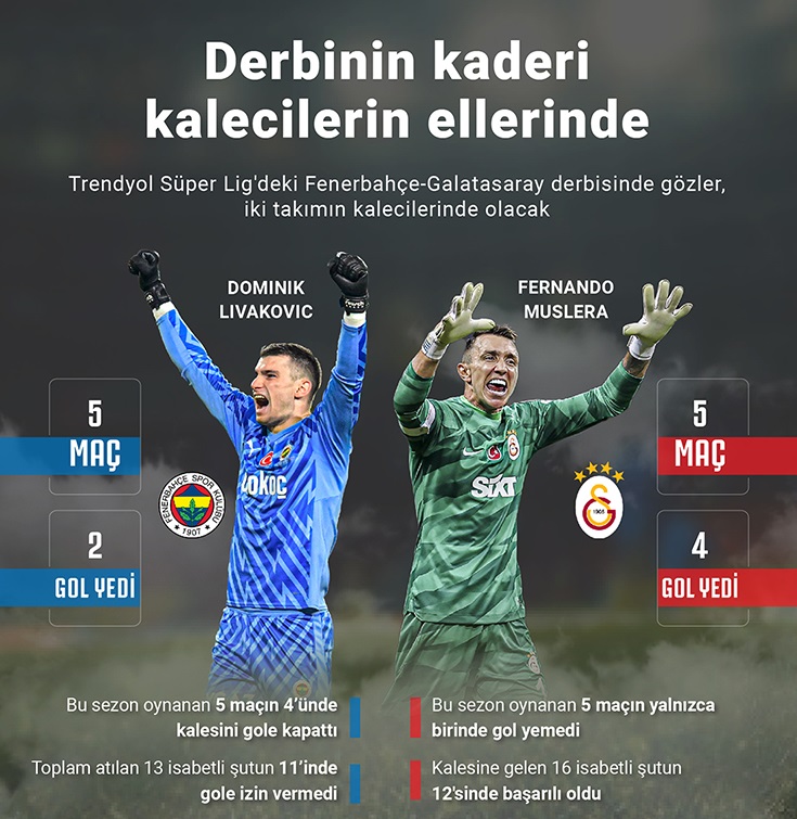 Fenerbahçe’nin Hırvat kalecisi Dominik Livakovic, Galatasaray’a karşı geçen sezon oynadığı iki derbide kalesini gole kapattı. İlk maç 0-0 sonuçlanırken, Galatasaray kaleye isabetli şut çekemedi. Livakovic, sezonun ikinci yarısındaki maçta da rakip forvetlere geçit vermeyerek ikinci derbisini de gol yemeden tamamladı. Geçen sezon Beşiktaş ve Galatasaray’a karşı toplamda 4 derbide 3 galibiyet, 1 beraberlik alan Livakovic, bu maçlarda sadece 2 gol yedi.