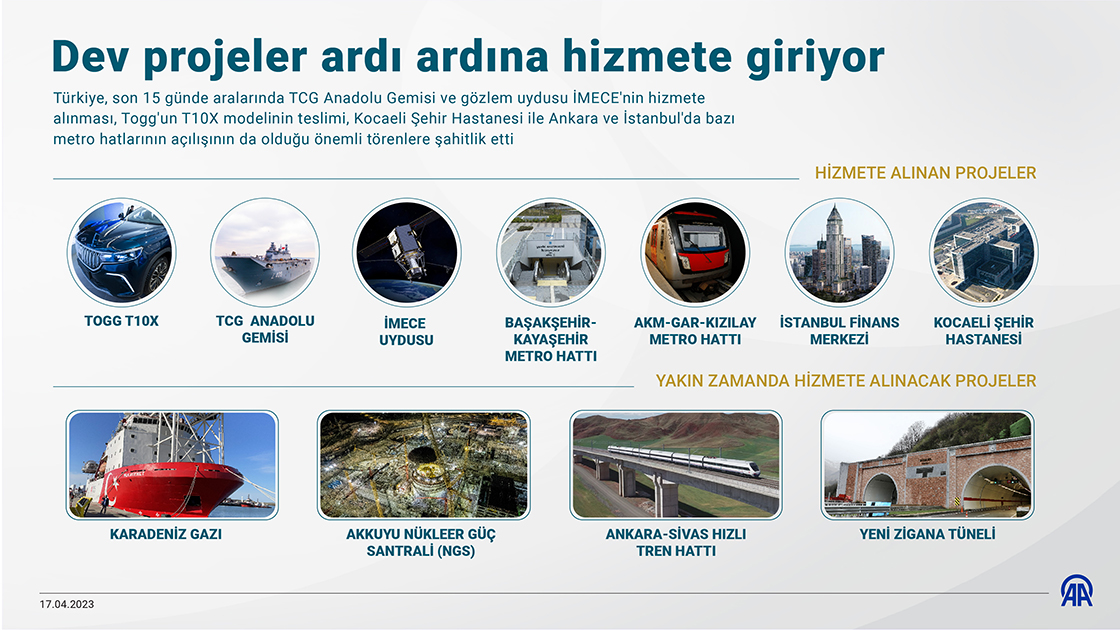 Türkiye, son 15 günde aralarında TCG Anadolu Gemisi ve gözlem uydusu İMECE'nin hizmete alınması, Togg'un T10X modelinin teslimi, Kocaeli Şehir Hastanesi ile Ankara ve İstanbul'da bazı metro hatlarının açılışının da olduğu önemli törenlere şahitlik etti.