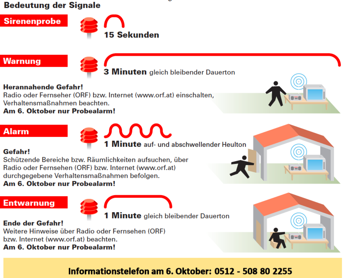 Avusturya genelinde 05.10.2019 Cumartesi günü prova alarm olarak, 15 dakika ara ile 4 farklı siren çalacak. Sirenlerin anlamı şu şekilde:
