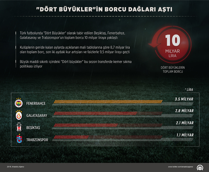 Türk futbolunda "Dört büyükler" olarak adlandırılan Beşiktaş, Fenerbahçe, Galatasaray ve Trabzonspor'un toplam borcu, son 6 yılda yüzde 360 arttı. Türk sporunun lokomotifi konumundaki büyük kulüpler, son yıllarda maddi sorunlarla boğuşuyor. Kulüplerin geldiği son noktada mali devamlılık sıkıntısı yaşanırken borçlar da giderek artıyor.