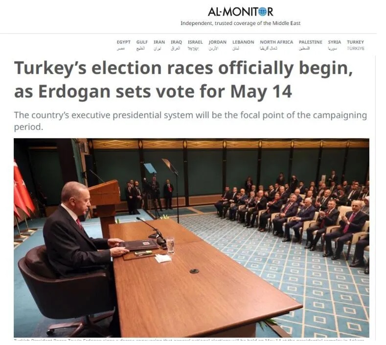 Amerikan Politico dergisi Erdoğan'ın resmi seçim tarihini belirlediğini duyurduğu haberinde seçimin planlanandan bir ay önce yapılacağını vurguladı ve Erdoğan'ın 14 Mayıs’ı, 6 Şubat'ta meydana gelen Kahramanmaraş merkezli depremlerdeki "yıkımın izlerini silecek hayırlı bir yarışa dönüştürmek" istediğini yazdı.