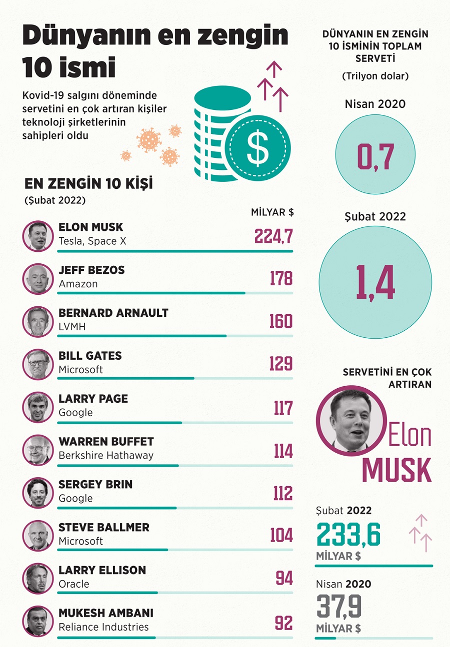 Salgın döneminde serveti en çok artan kişilere bakıldığında ise teknoloji işi ile uğraşan kişilerin ön plana çıktığı görülüyor. Bloomberg Billionaires Index'e göre Dünya Sağlık Örgütü'nün Kovid-19 pandemisi ilanının ardından Nisan 2020'de 37,9 milyar dolar servet sahip olan iş insanı Musk, Şubat 2022 itibarıyla 224 milyar dolar servete erişmiş durumda bulunuyor.