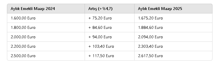%4,7'lik bir uyarlama faktörüyle aylık brüt emekli maaşı tablosu, bu artışın nasıl etkileyeceğini gösteriyor. Geçen yıl olduğu gibi, kademeli artışlar ve toplu ödemeler bu hesaplamada dikkate alınmadı. 2024 başından itibaren, emekliler aylık 5.850 Euro brüt üzerinde maaş alanlar için %9,7 oranında veya 567,45 Euro’luk toplu bir artış aldı.