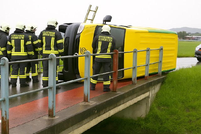 Cumartesi sabahı Feldkirch-Gisingen’de bir posta dağıtım minibüsü yan devrildi. 22 yaşındaki sürücü henüz bilinmeyen bir nedenle köprü korkuluğuna çarptı, ardından araç devrilerek yolun kenarına savruldu.