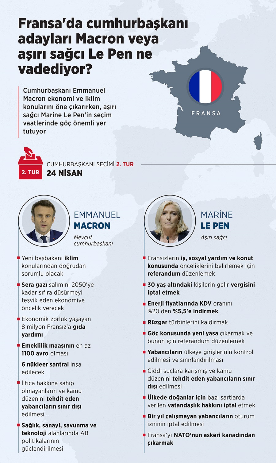 Macron ile Le Pen'in Avrupa Birliği (AB) ve NATO ile ilgili yaklaşımlarının çok farklı olması dikkati çekiyor.