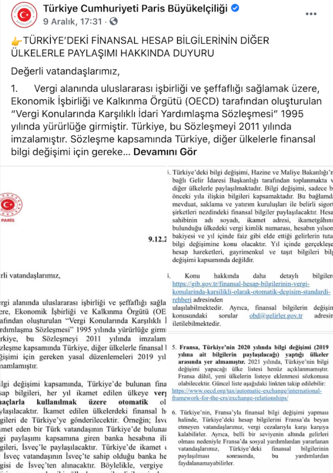 Açıklamada Fransalı Türklere yönelik uyarı da yer alırken şu ifadeler kullanıldı: “Türkiye’nin, Fransa’yla finansal bilgi değişimi yapması halinde, Türkiye’deki hesap bilgilerini Fransa’da beyan etmeyen vatandaşlarımız, vergi cezalarıyla karşı karşıya kalabilirler. Ayrıca, belli bir seviyenin altında gelirleri olması nedeniyle Fransa’da sosyal yardımlardan yararlanan vatandaşlarımız, Türkiye’deki finansal bilgilerinin paylaşılması sonrasında, bu yardımlardan faydalanamayabilirler.“