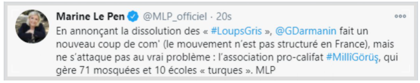 Le Pen mesajında Milli Görüş'ün "Hilafet yanlısı olduğunu" belirterek 71 cami ve 10 Türk okulunu idare ettiğini öne sürdü.