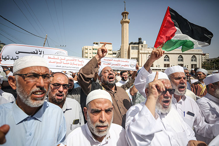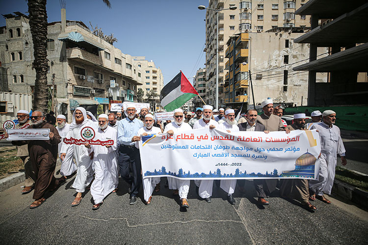 Filistinli Alimler Birliği ve Gazze'deki Yasama Meclisi Kudüs Komisyonunun da aralarında bulunduğu kurumların, Yahudi yerleşimcilerin, İsrail güçlerinin koruması altında bu sabah Mescid-i Aksa'ya düzenlediği baskını protesto için düzenlediği gösteriye çok sayıda kişi katıldı.