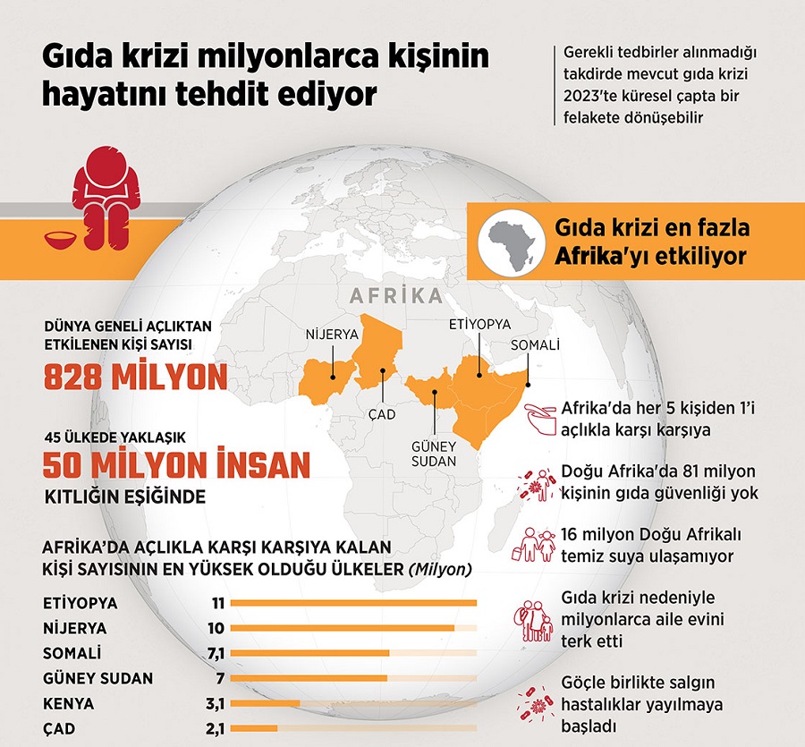 Birçok ülkede devam eden kuraklık ve çatışmalarla Ukrayna-Rusya savaşı nedeniyle tahıl sevkiyatındaki aksamalar gıda krizini derinleştirirken milyonlarca kişi açlık tehdidiyle karşı karşıya kaldı.