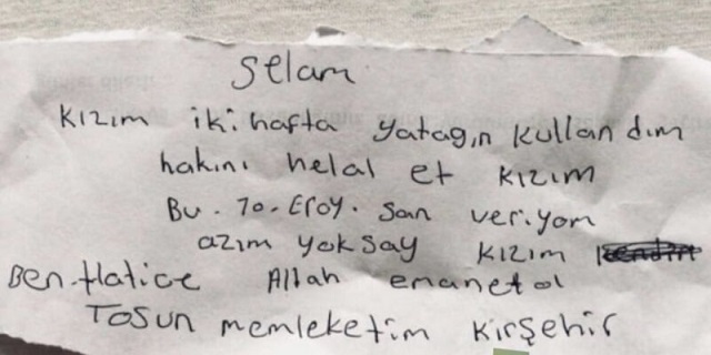 Yazdığı mesajda, “Kızım iki hafta yatağını kullandım hakkını helal et kızım. Bu 10 Euro’yu sana veriyorum. Ben Hatice memleketim Kırşehir. Allaha emanet ol.
