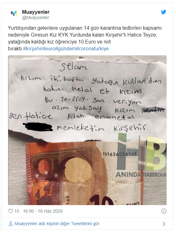 Pandemi nedeniyle yurt dışından Türkiye’ye getirilen vatandaşlar Türkiye’nin çeşitli şehirlerinde bulunan Kiredi Yurtlar Kurumu(KYK) yurtlarında karantina amaçlı tutulmuşlardı. Giresun’da ise karantina amaçlı kaldığı KYK yurdunda, yattığı yatağın sahibi kıza 10 euro harçlık bırakıp yanına da “hakkını helal et” notu bırakan gurbetçi kadın sosyal medyada gündem oldu.