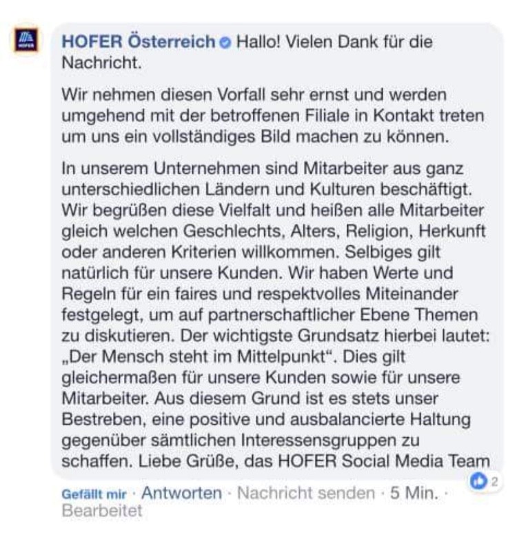 Gelen tepkiler ve olayın kamuoyuna yansıması sonrası Hofer Avusturya merkezi konu ile alakalı bir yazı paylaşarak, yaşanan bu tatsız olayın araştırılacağı ve olayın aydınlatılacağını bildirdi.