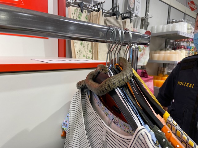 Yetkililer istenmeyen müşteriyi kasanın arkasındaki bir giysi rafında buldular. Polisin kendisini yakalama isteğine agresif bir şekilde tepki veren yılan memurlarıda strese soktu. Hayvan uzmanları tarafından teşhis edilen yılanın cinsi toksik olmayan çim yılanı olduğu anlaşılınca yetkililer ve işyeri çalışanları biraz rahat nefes aldı.