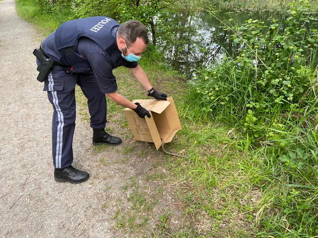 Şaşırtıcı derecede büyük olarak teşhis edilen yılan hayvanı daha sonra bir karton ile yakalanarak Rhein nehri yakınlarında doğaya bırakıldı.