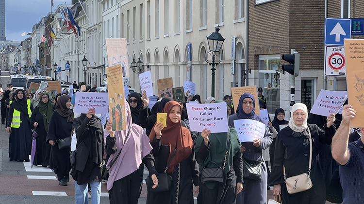Malieveld Meydanı'nda bir araya gelen, "Kur’an bize yol göstermek için ışık veriyor, ateş Güneş'i yakamaz", “Kur’an’ı seviyorum” yazılı dövizler ve Kur'an-ı Kerim taşıyan protestocular, Danimarka ve İsveç büyükelçiliklerine doğru yürüdü.
