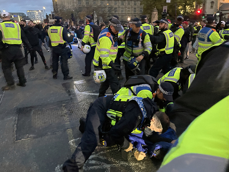Çoğunlukla futbol holiganlarından oluşan grubun gün boyu kendilerini Filistin'e destek yürüyüşüne katılanlarla karşı karşıya getirmemeye çalışan polise hakaret ve tehditler savurduğunu vurgulayan Twist, "Bu gruplardakilerin çoğu durdurulup arandı ve silah, cop, muşta gibi silahlar ile A sınıfı uyuşturucular (Kokain, eroin ve ecstasy vb.) ele geçirildi." açıklamasını yaptı.