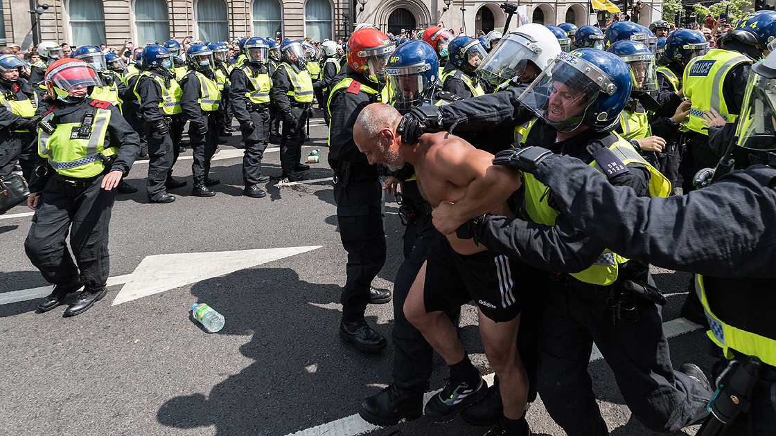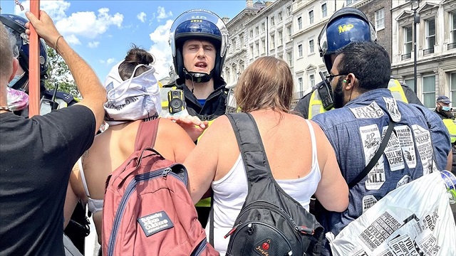 Başkent Londra'da Parlamento Meydanı'nda toplanan göstericiler, "Aşıya hayır, karantinaya hayır", "Çocuklarımızın üzerinden elinizi çekin", "Benim bedenim, benim kararım" yazılı pankartlar taşıyarak, hükümetin Kovid-19 tedbirlerini protesto etti.